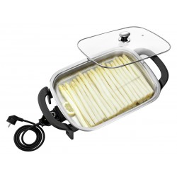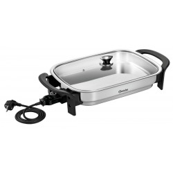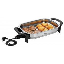 - Largeur à l'intérieur: 395 mm- Profondeur à l'intérieur: 275 mm- Coins arrondis à l'intérieur: Oui- Modèle: Restangulaire- Contenance: 4 litres- Hauteur à l'intérieur: 58 mm- Réglage de la température: En continu - Commande: Electronique, manette- Modèle intérieur: CNS 18/10- Puissance: 2.1 kW- Tension: 230 V- Fréquence: 50 Hz- Compris: 1 couvercle en verre- Dimensions: 630x315x65 mm (LxPxH)- Poids: 5.6 kg