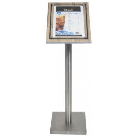 Le panneau d'affichage glass star en bois avec bordures en acier peut contenir 1 feuille A4 pour la présentation de votre menu. Il est livré avec pied + socle.