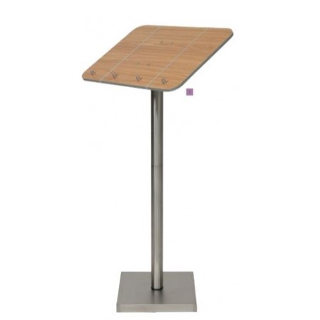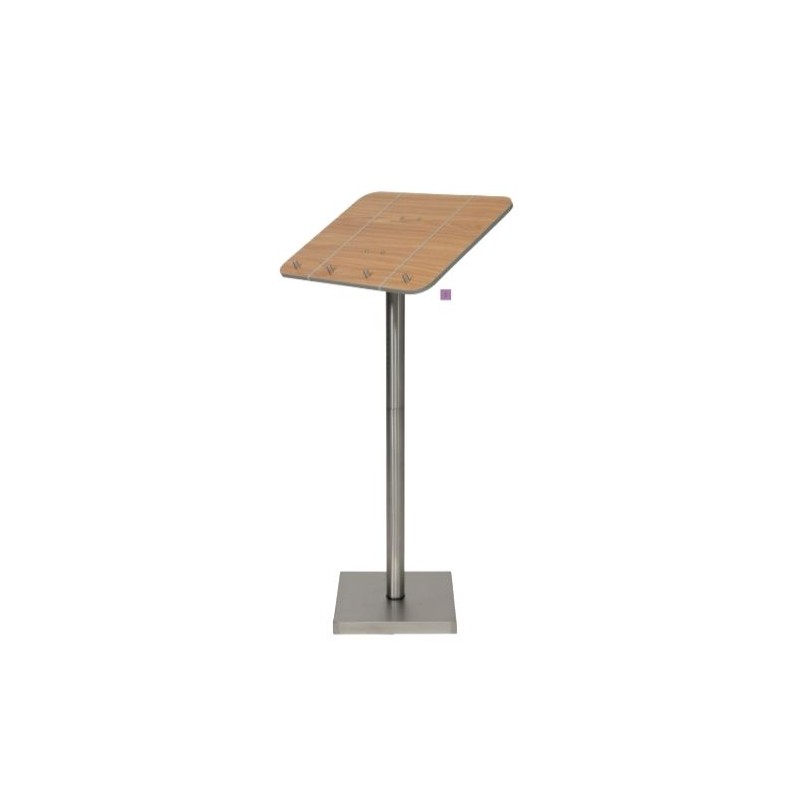 Présentoir en acier inoxydable avec panneau de bois laminé, bandes élastique intégrée et quatre supports pour maintenir un menu. Paire de roulettes et lampe LED disponible en options (non incluses)