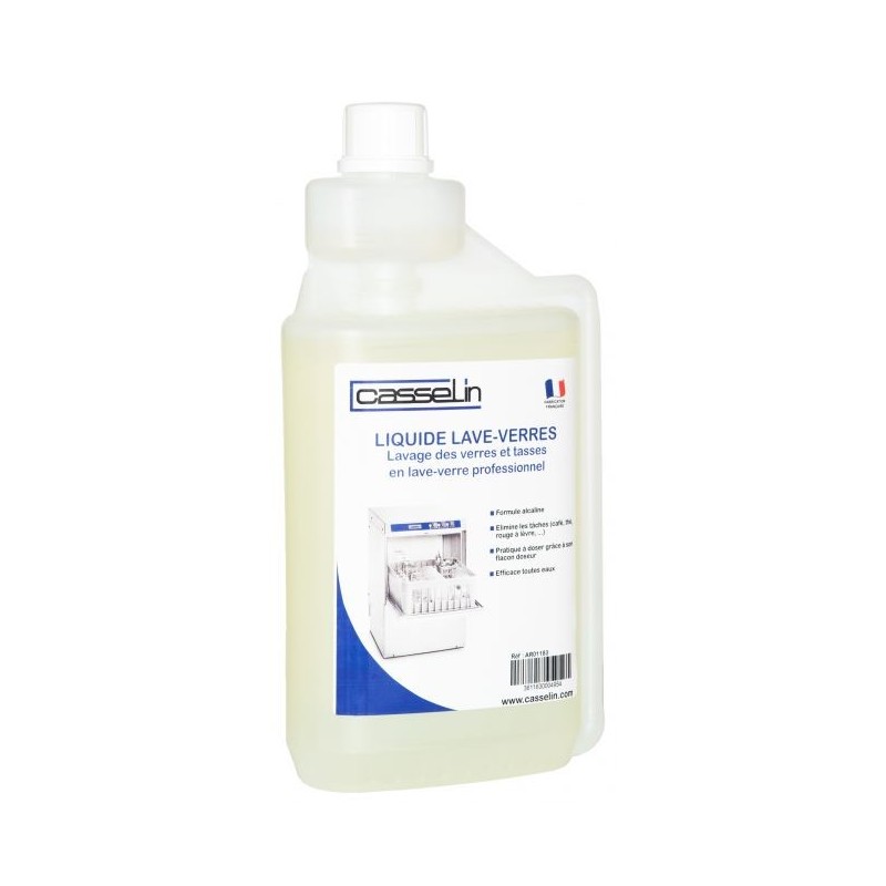 Liquide lave-verres 1L : Eliminez facilement les tâches de café, de thé ou de rouge à lèvres sur votre verrerie grâce à ce liquide lave-verre. Ce détergent alcalin chloré est spécialement conçu pour le nettoyage de vos verres, tasses et couverts en lave-verres professionnel.Pour les eaux moyennement dures, une dose de ce liquide lave-verre suffira à laver parfaitement votre casier. Pour les eaux très dures, n'hésitez pas à doubler la dose.Ce liquide est un détergent alcalin chloré qui élimine les tâches de café, thé et rouge à lèvre.Une dose correspond à une eau moyennement dure, en cas d'eau très dure, doubler la dose.