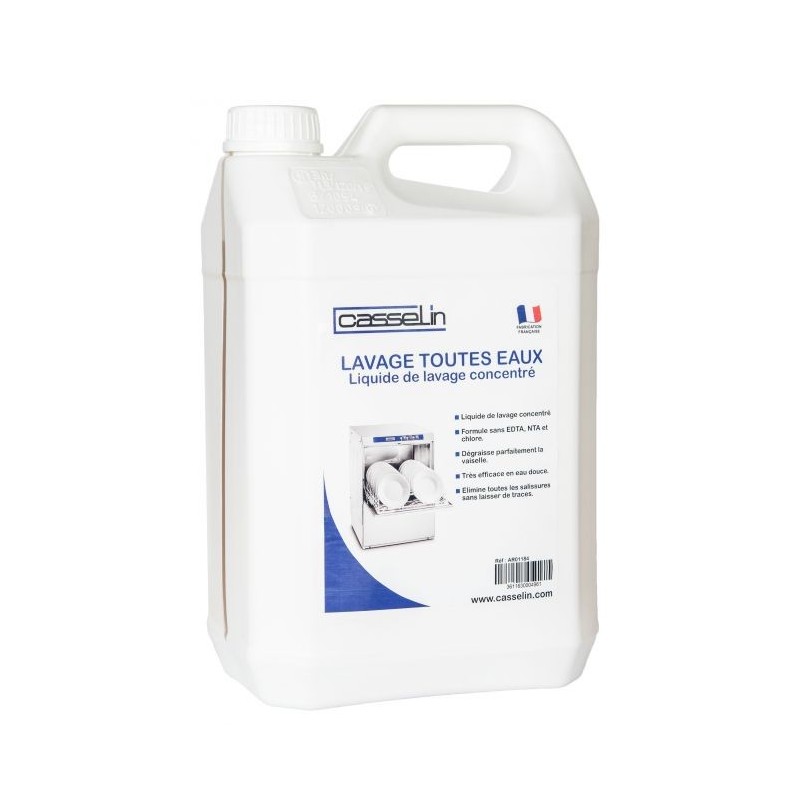 Liquide de lavage pour lave-vaisselle:Ce liquide de lavage toutes eaux de 5L vous permettra de laver efficacement votre vaisselle en lave-vaisselle professionnel.Il s'agit d'un détergent alcalin non chloré qui doit être dosé en fonction de la dureté de l'eau et du degré de salissure de votre vaisselle.Pour un lavage optimal, votre lave-vaisselle doit laver à une température comprise entre 55°C et 60°C.