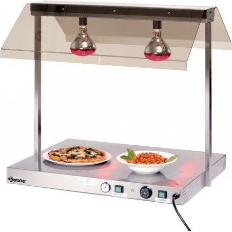 La planche à trancher en acier inox est équipée de 2 lampes chauffantes pour le maintien à température des plats.