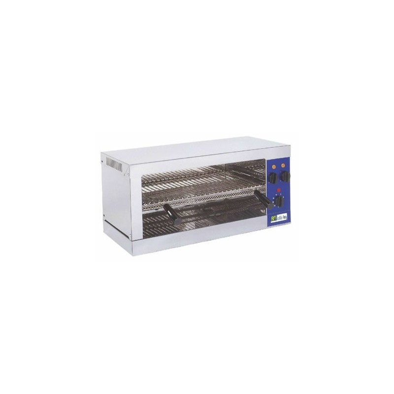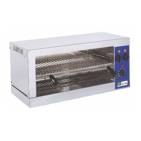 - Ce toaster électrique tout inox, est équipé d’une grille de protection des tubes quartz, de résistances à tubes quartz renforcées, d’une minuterie 0-15min, de témoins lumineux de fonctionnement et d’un sélecteur de chauffe sol/voûte.