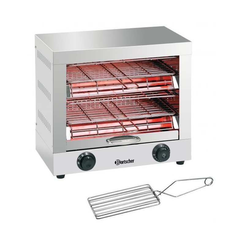 Le toaster double professionnel dispose d'un boitier inox ainsi que d'une minuterie de 15 minutes. Ce matériel fonctionne grâce à des résistances en quartz et est équipé de 2 grilles. Ce toaster double pro est idéal dans la restauration pour de nombreux commerces de types boulangeries, snack, sandwicheries ou fast food. Le toaster double est un appareil à toaster et gratiner. Il est destiné qu'à chauffer vite, décongeler des produits, griller sans réchauffer l'appareil.