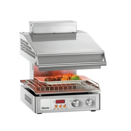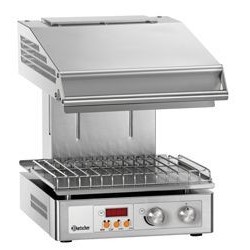 Acier inoxydable 18/10 - Tête mobile -- Grille et lèchefrite -- Dimensions grille : L 400 x P 304 mm -- Puissance : 3 kW / 1 NAC 230 V -- Dimensions : L 400 x P 570 x H 515 mm -- Poids : 49.8 kg