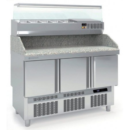 Cette table à pizza réfrigérée possède un thermostat électrique avec afficheur digital, spécial économie d'énergie.Pour un gain de place, son évaporateur ventilé traité anti-corrosion, se situe en dessous du meuble à pizza 3 portes.Ce meuble à pizza 320 litres est livré avec une clayette rilsan GN 1/1 et 1 jeu de glissière par porte réglable en hauteur.