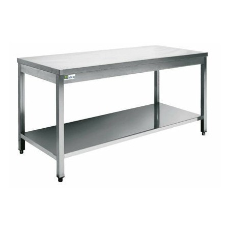 - Cette table inox aisi 304 est équipée d‘une tablette inférieure renforcée par profil oméga, de tubes carrés 40 x 40 mm et d’un plan supérieur de 1,20 mm renforcé par plaque mélaminée.