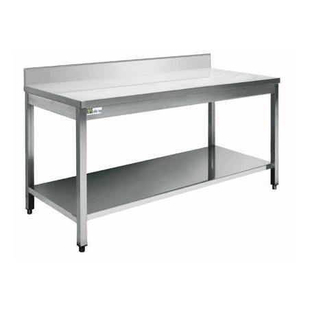 - Cette table inox aisi 304 est équipée d‘une tablette inférieure renforcée par profil oméga, d’un dosseret, de tubes carrés 40 x 40 mm et d’un plan supérieur de 1,20 mm renforcé par plaque mélaminée.