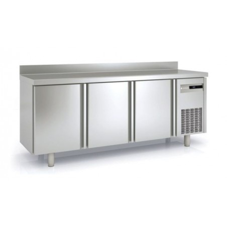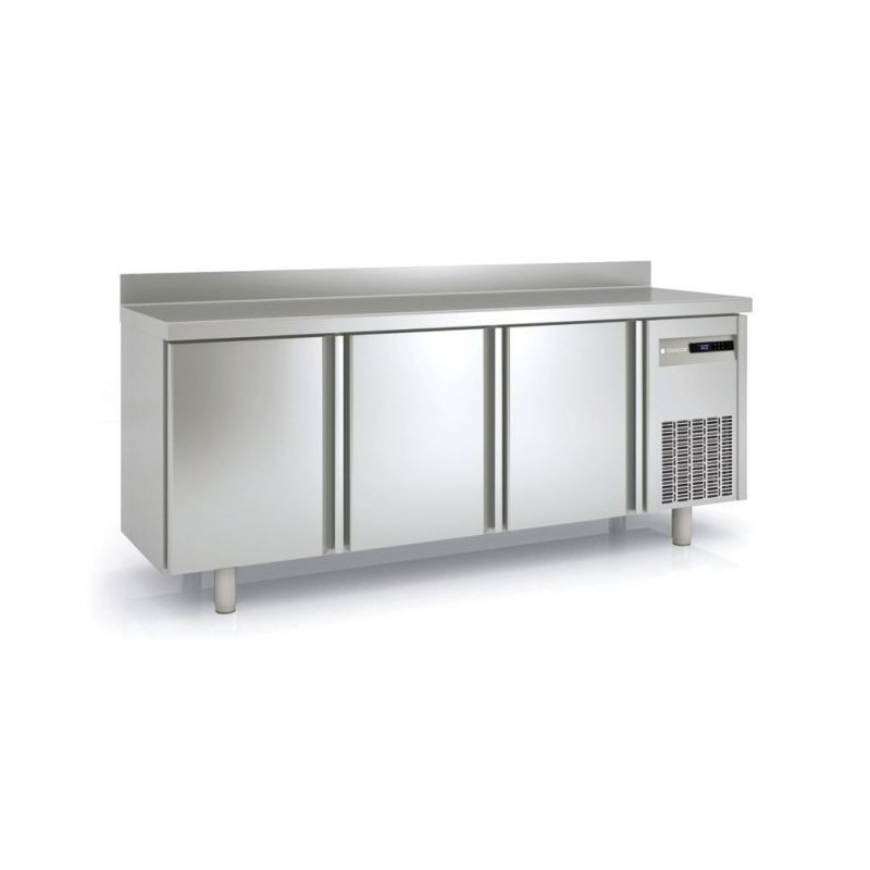 Le compresseur hermétique sur glissières est ventilé. La table réfrigérée positive a également un évaporateur ventilé traité anti-corrosion. Un thermostat électronique permet de contrôler la température allant de - 2°C à + 8°C par affichage digital. Le dégivrage du meuble réfrigéré se fait par résistances en négatif, tandis que l'évaporation est automatique.