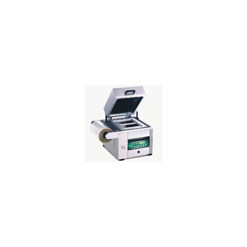 Cette machine est équipée d'une pompe pour la mise sous vide des barquettes avec injection de gaz pour compensation, elle est alors idéale pour une utilisation en supermarchés ou laboratoires avec une cadence de travail jusqu'à 300 barquettes par jour.