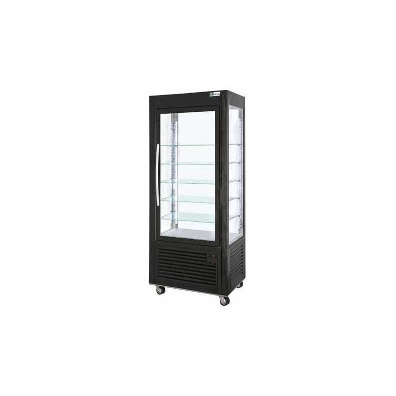 Cette vitrine panoramique est équipée d'un éclairage LED blanc type boulangerie sur les 4 montants intérieurs. Elle est montée sur 4 roues à doubles patins. Le système de réfrigération est ventilé pour une température homogène (classe T3 - test à 25°C - 70% d'humidité).